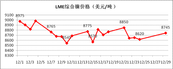 對(duì)于來(lái)年1月份走勢(shì)判斷,從技術(shù)面看,倫鎳在未站穩(wěn)8800美元/噸以上時(shí),市場(chǎng)仍舊存在下跌至8100美元/噸一線的風(fēng)險(xiǎn),甚至存在創(chuàng)新低的可能。從基本面看,倫鎳庫(kù)存依舊高位,表面看市場(chǎng)供應(yīng)繼續(xù)充足,但從中國(guó)進(jìn)口精煉鎳、鎳鐵的量來(lái)看,并未呈現(xiàn)繼續(xù)增加的態(tài)勢(shì),可見(jiàn)實(shí)際國(guó)外供應(yīng)量已基本接近現(xiàn)有峰值,國(guó)內(nèi)將進(jìn)入去庫(kù)存化周期,對(duì)于鎳市短期而言弱勢(shì)盤(pán)整是主流。